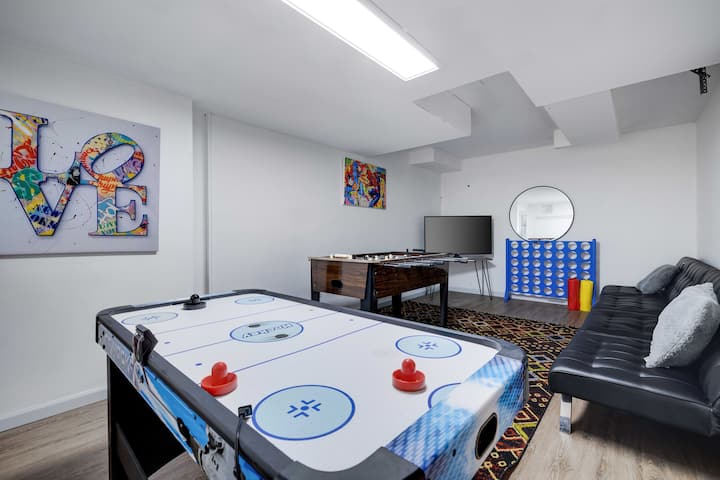 Chumba cha ☀ Mchezo: Kiko kwenye ghorofa ya chini, sehemu hii imejaa burudani, ikiwa na michezo ya arcade, meza ya bwawa, na viti vingi kwa usiku wa ushindani wa kirafiki.
