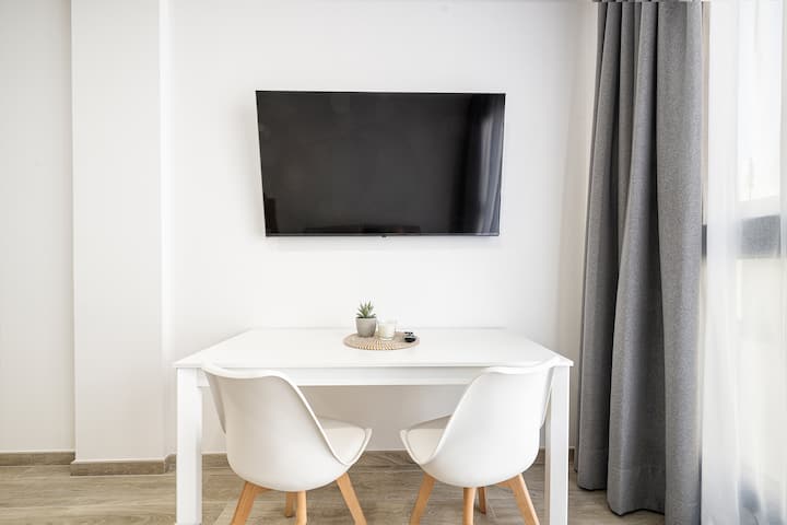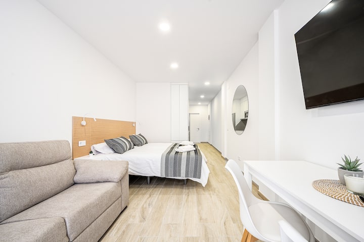 Mita 400 tu kutoka pwani ya Playa de Las Canteras na katika jengo la kipekee la likizo lililojengwa hivi karibuni, fleti hii ya kisasa na angavu ni bora kwa utalii au kazi. Ukiwa na jiko lenye vifaa kamili, Wi-Fi ya kasi, Televisheni mahiri na sehemu ya kazi, inatoa starehe ya kujisikia nyumbani. Iko Las Palmas de Gran Canaria, karibu na migahawa, maduka na vivutio vya kitamaduni, ni bora kwa ajili ya kuchunguza jiji au kupumzika kando ya bahari.