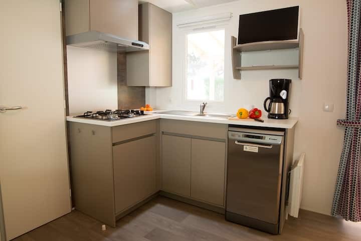 Gundua starehe ya Mediterania katika nyumba hii ya kifahari inayotembea, bora kwa familia au makundi madogo. Furahia sehemu za ndani zenye viyoyozi, chumba cha kupikia kilicho na vifaa vya kutosha kilicho na mashine ya kuosha vyombo na mtaro wa kujitegemea uliofunikwa. Iko kilomita 1 tu kutoka Espiguette Beach na karibu na katikati ya mji wa Grau-du-Roi, pia utaweza kufikia mabwawa, uwanja wa michezo, viwanja vya michezo na vivutio vya karibu kama vile Aigues-Mortes na Port-Camargue Marina. Inafaa kwa ajili ya mapumziko na jasura.