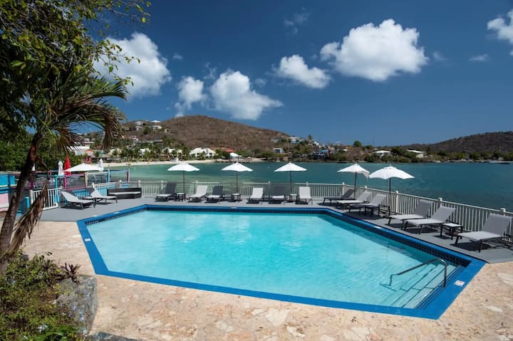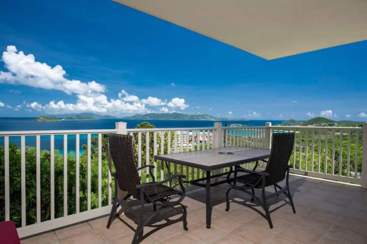 Jiwazie ukiwa juu ya Bahari ya Karibea katika kondo hii ya 1BR/1BA yenye upepo mkali huko Point Pleasant. Ukiwa na roshani inayozunguka ambayo inakumbatia kilima, utaamka kila asubuhi ukihisi kana kwamba uko juu ya ulimwengu-kwa kweli. Roshani ni kiti chako cha mstari wa mbele hadi mandhari ya kupendeza ya mawio ya jua juu ya St. John na Visiwa vya Virgin vya Uingereza, na jua linapozama, bado utakuwa katika nafasi nzuri ya mandhari ya kisiwa (na labda glasi ya kitu cha kitropiki mkononi).