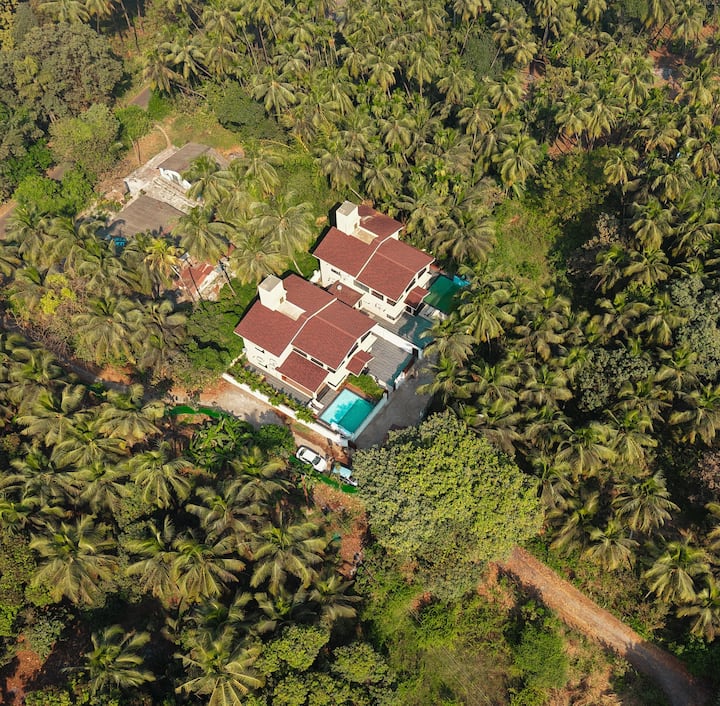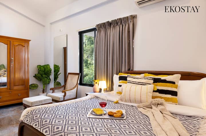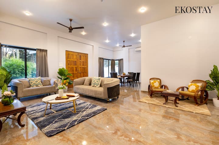 Ekostay Saturn Villa huko Alibaug inatoa Vila ya BHK 8 inayovutia, ikitoa mapumziko kutokana na shughuli nyingi za jiji. Imewekwa katika eneo la Mumbai sawa na Hamptons, Alibaug, makao haya ya ndoto yanavutia. Iwe unachagua kukaa kwenye jua kando ya bwawa la nje la kujitegemea au kujifurahisha katika karamu za kuchoma nyama zinazoambatana na joto la moto wa bon (unaopatikana kwa malipo ya ziada), ni vigumu kupinga kishawishi cha kuongeza ukaaji wako katika eneo hili tulivu.