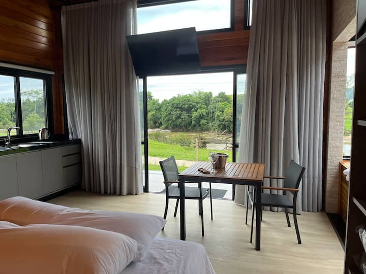 Nyumba ya mbao ya hali ya juu, beseni la maji moto na mwonekano wa mto