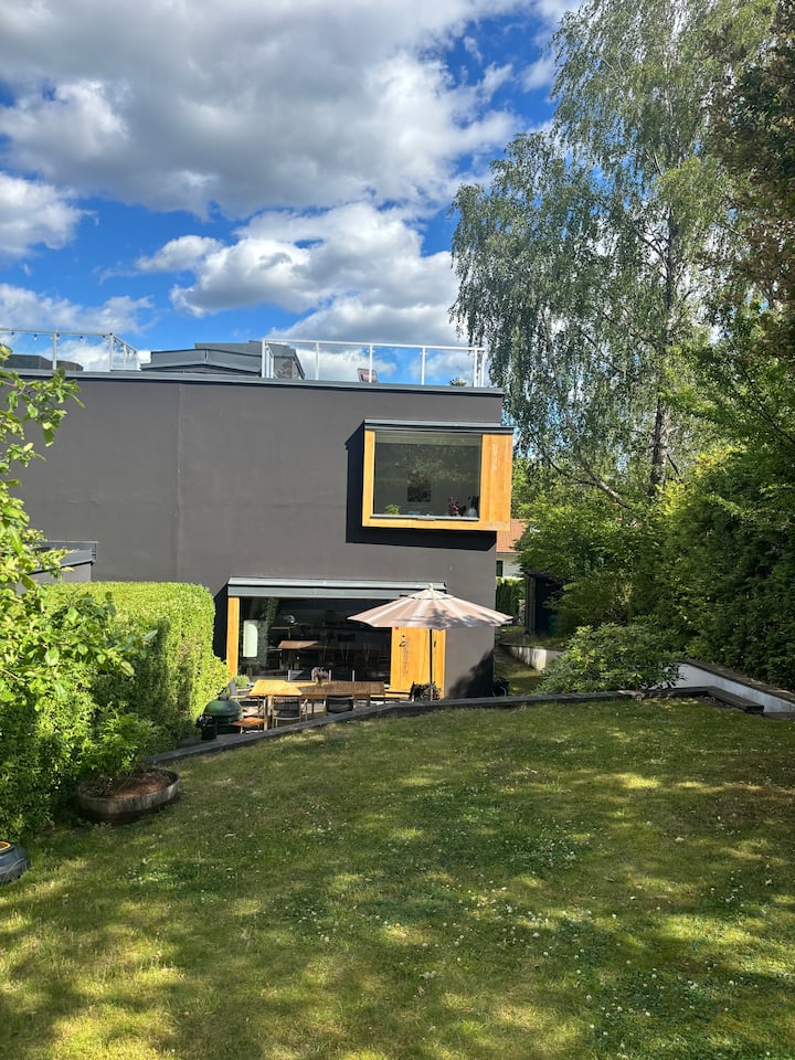Nyumba ya kisasa iliyo na sehemu ya juu ya paa yenye jua