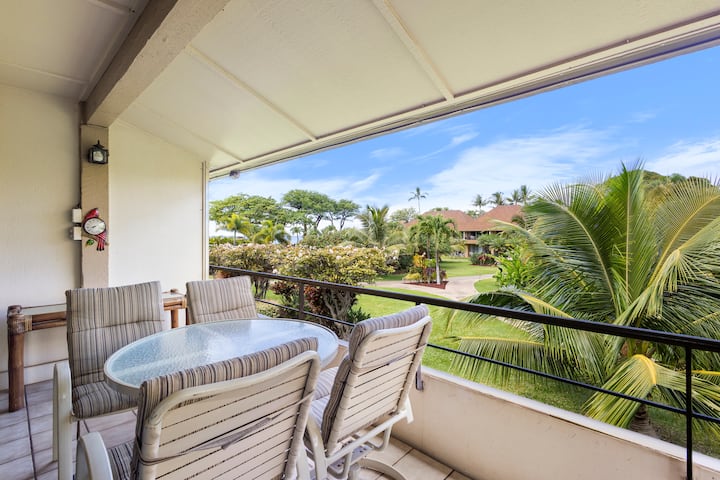 Nyumba hiyo ni studio ya ghorofa ya pili ya kona ambayo hupata jua la asubuhi kwenye lanai - mahali pazuri pa kupata kifungua kinywa chako na ulinzi dhidi ya jua wakati wa joto la mchana. Kama ilivyo kwenye ghorofa ya pili unaweza kuacha milango ya lanai ikiwa wazi usiku ili kuingiza upepo na sauti ya mawimbi.