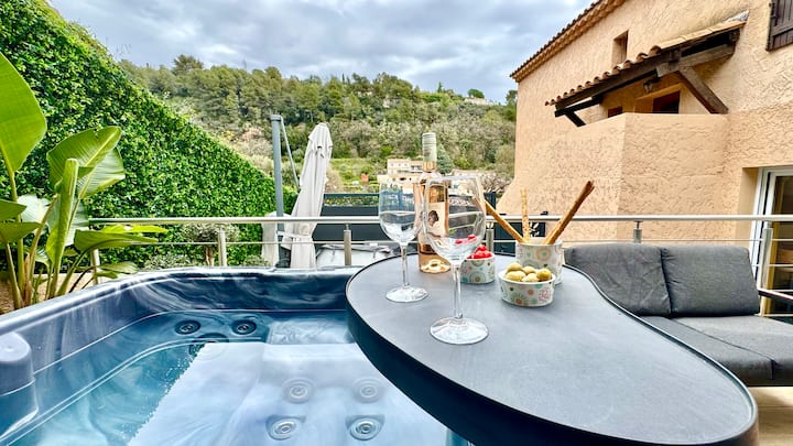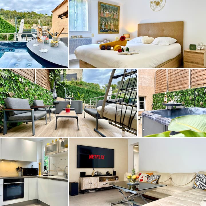 ★ Kimbilia kwenye nyumba yetu ya kupendeza huko Cagnes-sur-Mer. Sebule angavu, vyumba viwili vya kulala vya kifahari, jiko la kifahari lenye vifaa kamili. Mtaro wa kipekee ulio na jakuzi ya kujitegemea, ukumbi wa bustani na jiko la kuchomea nyama lililozungukwa na mazingira ya asili. Maegesho mawili ya kujitegemea (hayafai kwa magari ya chini ya michezo). Dakika chache tu kutoka ufukweni na katikati ya jiji – furahia mchanganyiko wa kipekee wa anasa na utulivu. ★