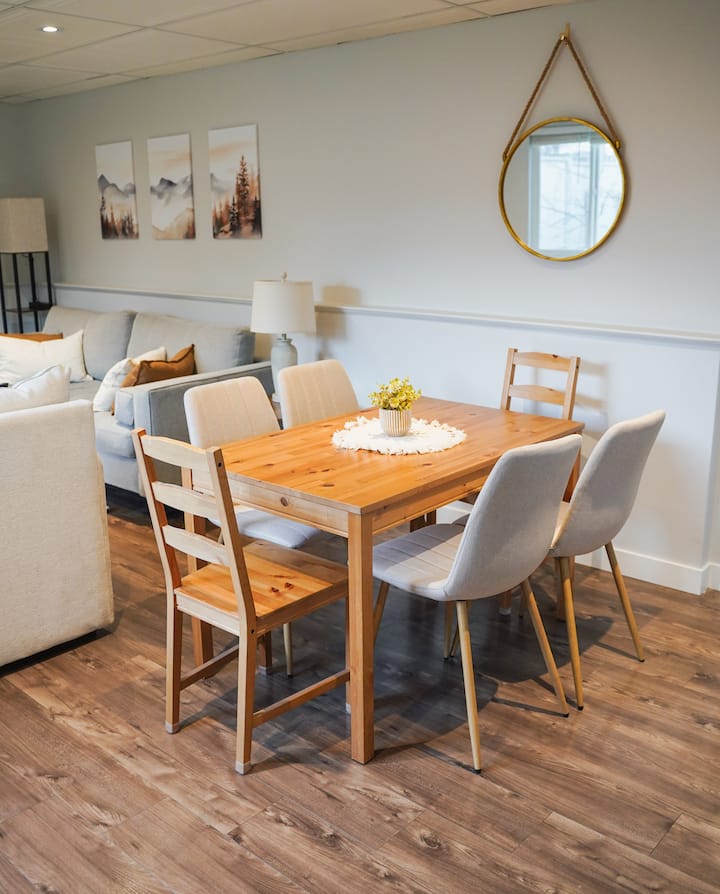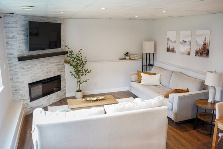 Sebule yenye starehe na Eneo la Burudani: Furahia usiku wa sinema kwenye televisheni janja ya inchi 50 iliyo na Roku. Jioni za baridi, washa meko ya umeme kwa ajili ya mazingira ya joto, yenye starehe unapopumzika kwa kutumia kitabu au mchezo wa ubao. Sebule pia ina meza ya kulia chakula. Tumeweka hata vitu kadhaa vya kuchezea, mafumbo na michezo ya ubao ili kuwafurahisha watoto na watu wazima wakati wa ukaaji wako. Hii ni nyumba ya kweli ya mbali-kutoka nyumbani ambapo unaweza kupumzika baada ya siku ya jasura. Taa zinajumuisha bandari za kuchaji za USB.