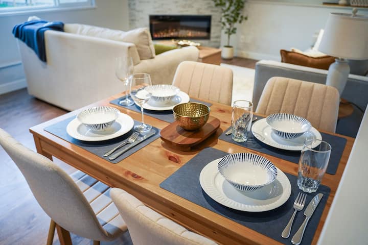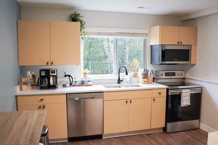 Bafu la Kisasa na Ufuaji wa Ndani ya Chumba: Bafu la chumba lina beseni la kuogea/bafu na mashine ya kuosha na kukausha yenye ukubwa kamili ili uweze kufua nguo wakati wa ukaaji wako.