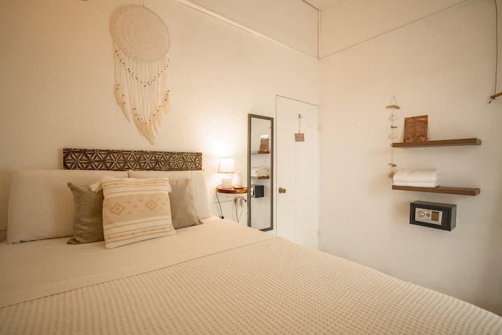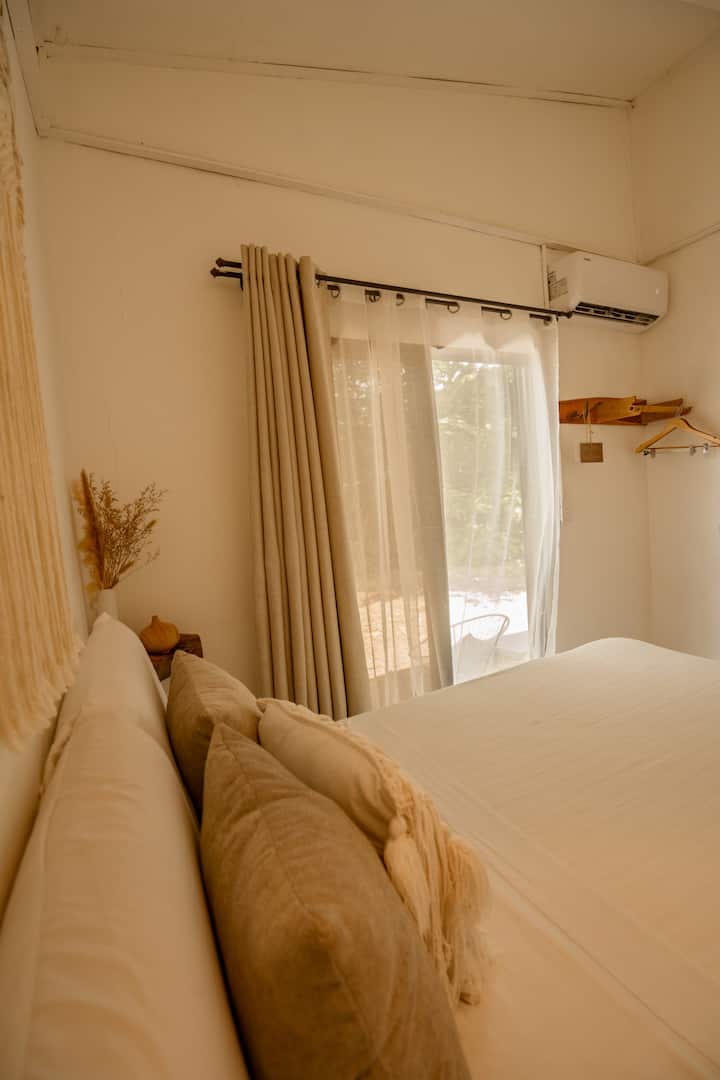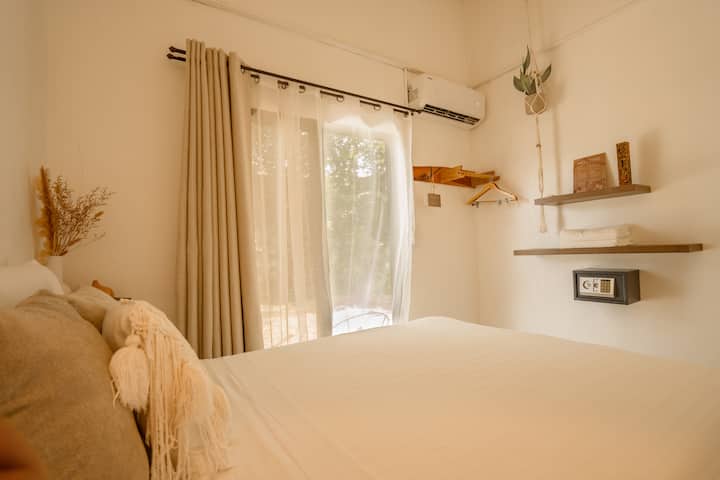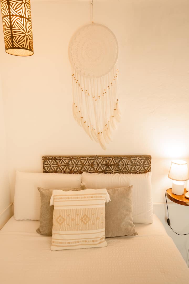 chumba cha starehe cha msafiri anayesafiri peke yake katika hoteli ya boho boutique