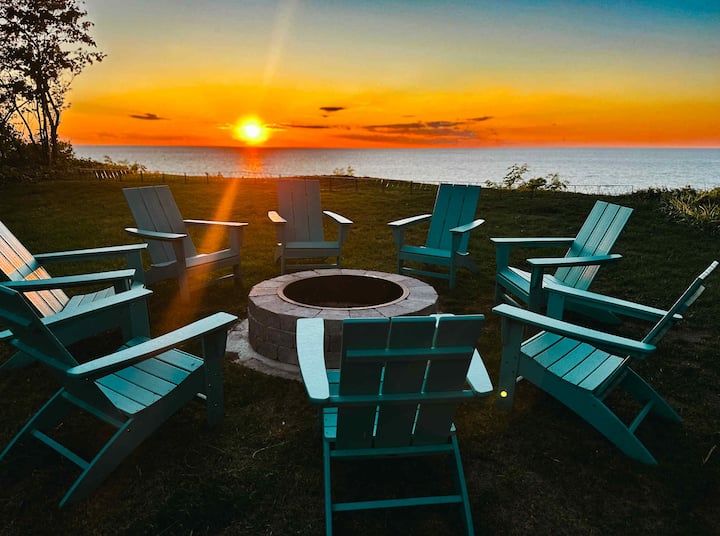 Furahia shimo mahususi la moto la mawe, staha kubwa ya nyuma iliyo na jiko la kuchomea nyama na viti vya nje na sehemu za kula, na machweo mazuri juu ya Ziwa Michigan kila jioni.