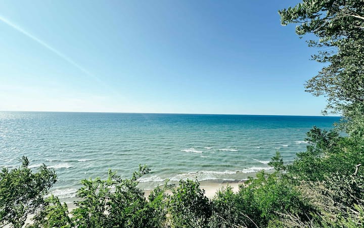 Tumia siku zako kufurahia rangi ya majira ya kupukutika kwa majani na ziara za mvinyo, matembezi marefu, mabomu ya ufukweni, kupiga tufaha, kutazama ndege, na kukunja karibu na moto kwenye bluff nje au kupiga mbizi ndani kabla ya meko ya gesi, ukisikiliza mawimbi jua linapozama juu ya Ziwa Michigan.