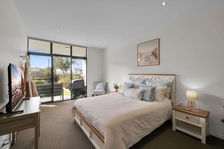 Master Bedroom – Kitanda aina ya Queen kilicho na vazi la kuingia, Televisheni mahiri, chumba cha kulala (bafu na choo), kiyoyozi na ufikiaji wa moja kwa moja wa baraza. Iliyoundwa kwa ajili ya starehe na faragha ya kiwango cha juu.