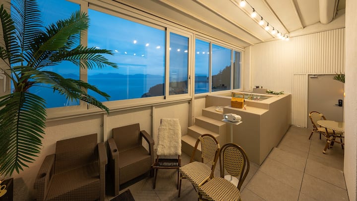 Chumba cha 301 chenye jacuzzi na mwonekano wa bahari, kikiwa na mandhari ya bahari ya bluu