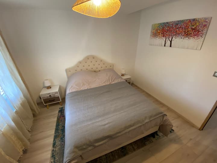 • Chumba 1 cha kulala cha takribani m ² 12 na kitanda cha sentimita 160, roshani 2 zilizo na taa 2 kando ya kitanda, sehemu 1 ya kuhifadhia, kiti 1 cha mikono kilicho na vizuizi vya miguu.