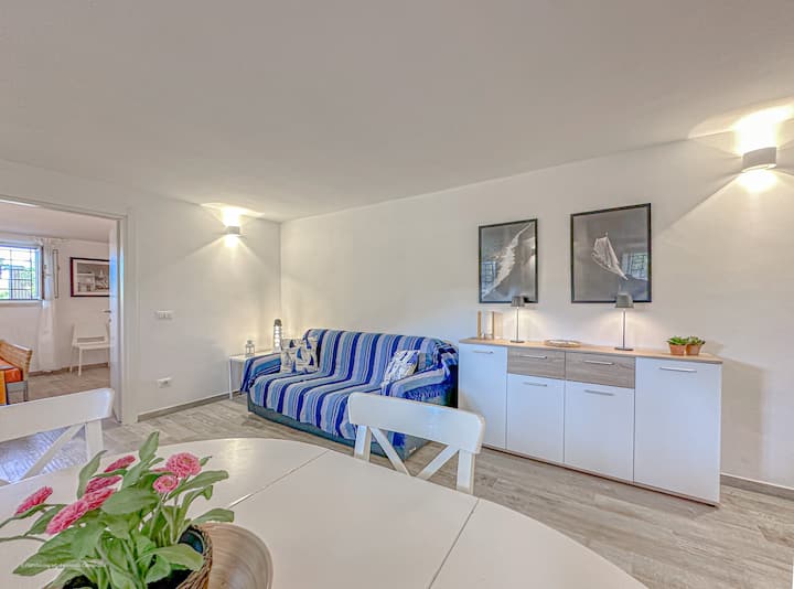 Kwa muhtasari: ufikiaji wa kipekee wa fleti + matumizi ya maeneo ya kijani ya vila + ufikiaji wa moja kwa moja wa ufukwe + maegesho ya kujitegemea.