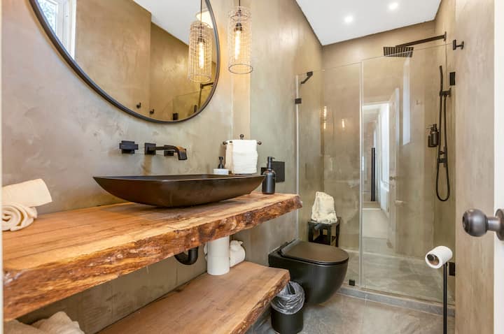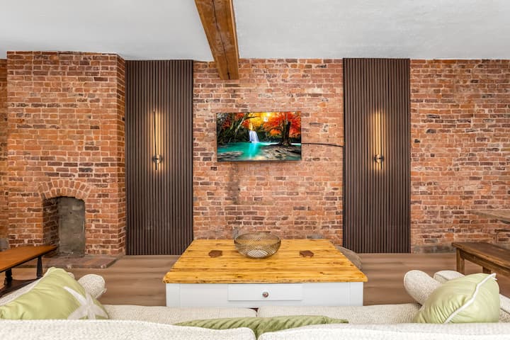 Ghorofa ya 1:Ubunifu wa wazi wa dhana ulio na kuta zilizoondolewa, paneli za mbao, matofali yaliyo wazi na choo cheusi chenye ujasiri katika bafu kamili maridadi. Maeneo ya kuishi na kula yenye starehe yenye Televisheni mahiri na bafu kamili.