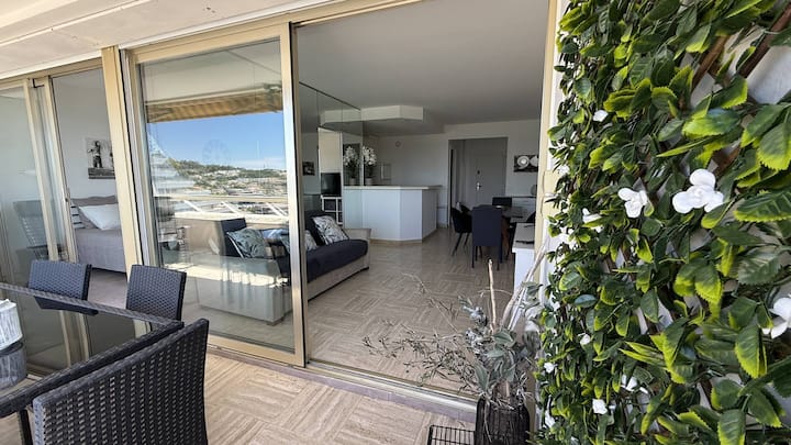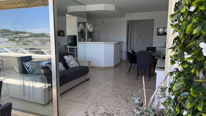 Fleti 60 m² iliyo na mtaro mkubwa wa m² 12, mwonekano wa ajabu wa bahari kwenye ghorofa ya 10 iliyo na lifti, iliyopambwa vizuri na iliyo na vifaa vya kiwango cha juu, iliyo katika Villeneuve-Loubet Plage katika makazi ya Marina Baie des Anges Le Ducal.
