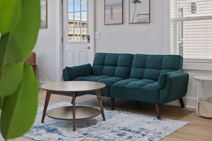 Pumua katika hewa yenye chumvi na utulie katika anasa iliyopangwa katika Surf Sun Pura Vida – Kitengo cha 3. Imewekwa kwenye ngazi ya pili ya likizo ya ufukweni yenye nyumba tano, bandari hii yenye vyumba 2 vya kulala inachanganya ubunifu safi wa kisasa na vitu vya starehe, hatua chache tu kutoka kwenye mchanga na kuteleza mawimbini.
