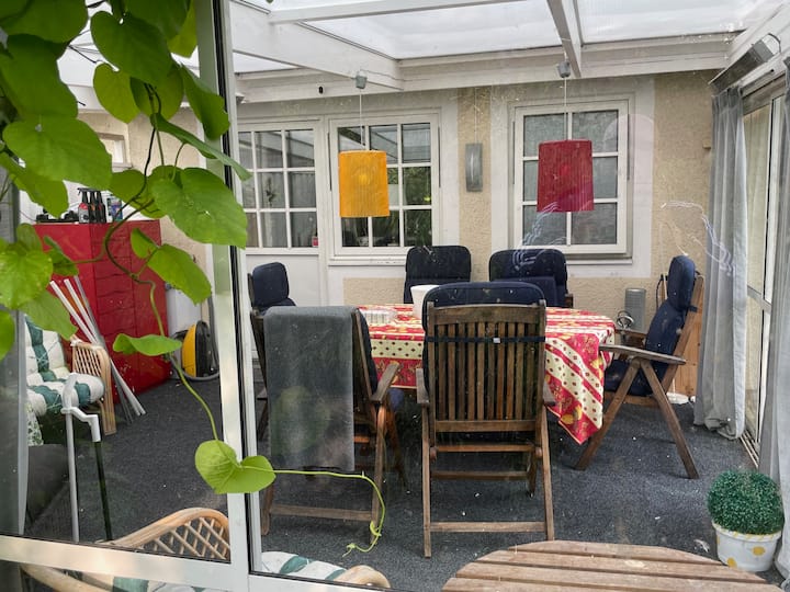 • Hifadhi ya mazingira hufikiwa moja kwa moja kutoka jikoni na ina meza kubwa ya kulia iliyo na viti 6 na viti vya ziada kwa ajili ya mapumziko