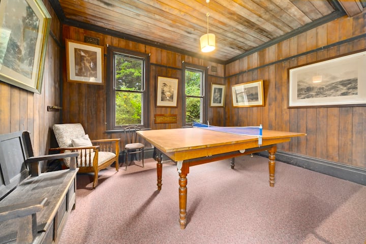 Njia ndefu za ukumbi zinaelekea kwenye chumba kikubwa cha familia — sehemu nzuri ya kukusanyika iliyopashwa joto na meko ya pili. Hapa utapata meza ya zamani ya ping pong, piano, michezo ya ubao, mafumbo, na seti ya chess, zote zimewekwa dhidi ya mwonekano wa bustani kubwa. Ni mahali pazuri pa kuungana tena, kupumzika na kushiriki nyakati za polepole na rahisi.