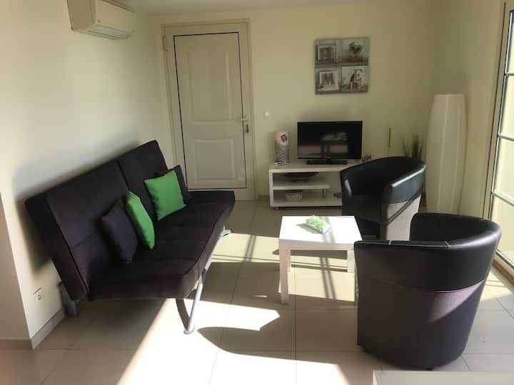 Fleti yenye vyumba viwili vya kulala, mwonekano wa bahari na bwawa