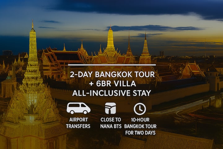 Kifurushi kisichoweza kushindwa: Ziara ya siku 2 ya Bangkok + vila ya paa ya 6BR + uhamishaji wa uwanja wa ndege! Furahia mita 500 na zaidi za mraba katika eneo kuu la Nana, mita 800 tu hadi BTS na burudani ya usiku. Mandhari ya paa, jiko kamili na starehe ya kisasa. Sehemu bora ya kukaa ya Bangkok ~inayofaa kwa makundi, familia au safari za kibiashara. Inajumuisha kuchukuliwa kwenye uwanja wa ndege, huduma ya usafishaji na ziara ya jiji iliyopangwa iliyojaa mahekalu, chakula, vito vya eneo husika na utamaduni. Tukio bora la Bangkok linasubiri!