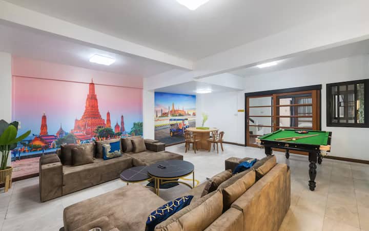 Nyumba hii mpya iliyokarabatiwa ina vyumba 6 vya kulala (vitanda 11 vya ukubwa wa King, kitanda 1 cha mtu mmoja) na nafasi kubwa ya kupumzika, kula na burudani. Umbali wa kutembea kwenda NANA BTS (dakika 10), NANA Plaza (dakika 5) na Bustani ya Msitu ya Benjakitti (dakika 1).