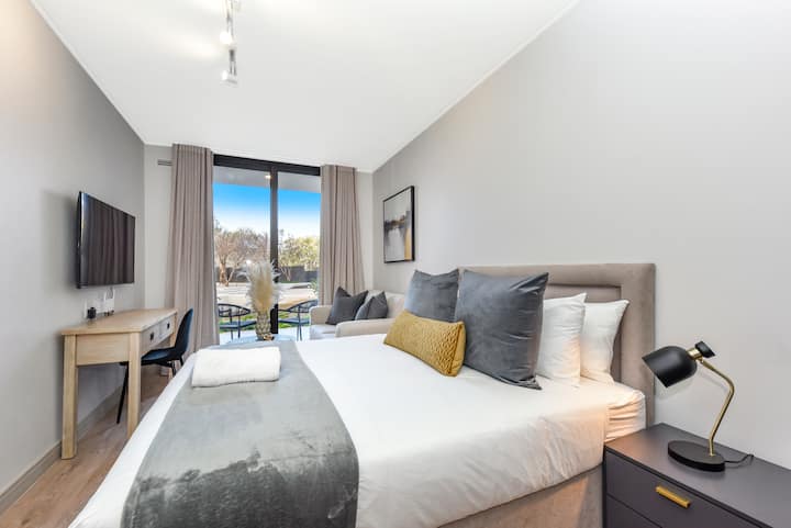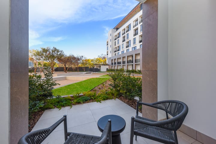 Wakati mapigo mahiri ya jiji yanakuita nje, ingia kwenye mtaro wako wa kujitegemea. Hapa, jua la dhahabu la Kiafrika linakufunika kwa joto unapokaa na kupumua katika mandhari, mapumziko ya karibu ambapo unaweza kunyoosha miguu yako, kunywa kinywaji unachokipenda, na kunusa mdundo wa upole wa maisha ya Rosebank.