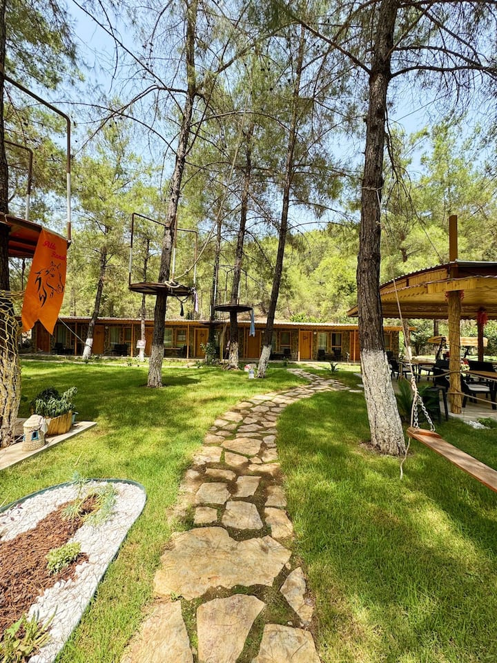 Likizo mahususi ya bohemia katika mazingira ya asili inakusubiri chini ya Karataş Twin Rocks. Uzoefu kamili na vyumba vya mapambo vya kujitegemea, bwawa la kuogelea, maeneo ya kuchoma nyama, safari za farasi na matembezi ya Lycian Way. Fukwe nzuri zaidi za Kemer na Phaselis za kihistoria ziko umbali wa dakika chache tu kutoka kwenye miji ya kale kama vile Olympos. Nyakati zisizoweza kusahaulika katika mazingira ya asili zinakusubiri katika kituo hiki kinachofaa familia, chenye amani na salama.