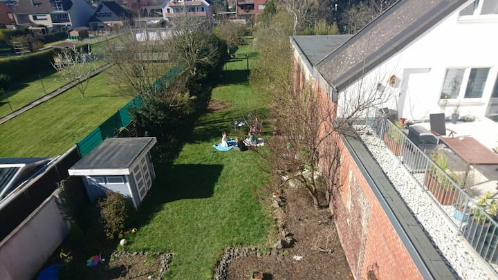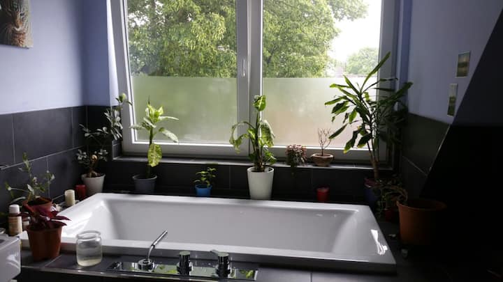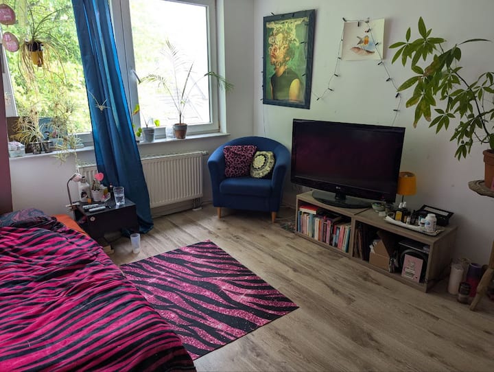 Chumba "Ndege" katika fleti ya pamoja ya nyumba na S-Bahn hadi Deutz/Messe!