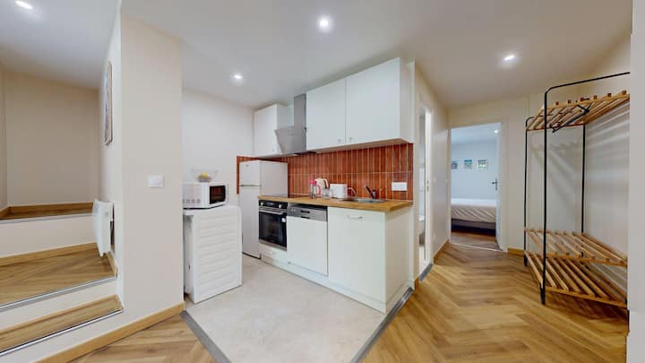 Kila kitu unachohitaji: gundua jiko la sebule lililo wazi lenye vifaa kamili vya friji/friza, hob, oveni, mikrowevu, mashine ya kuosha vyombo, birika, mashine ya kutengeneza kahawa ya plunger ya Bodum, toaster. Kahawa, chai na vikolezo vya msingi vinatolewa ili kuboresha kituo chako. Mashine ya kufulia, meza na pasi hukamilisha vifaa.