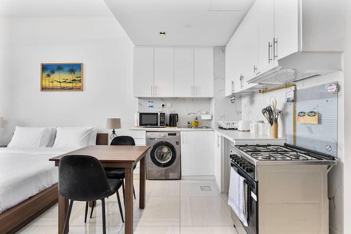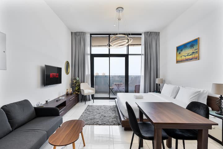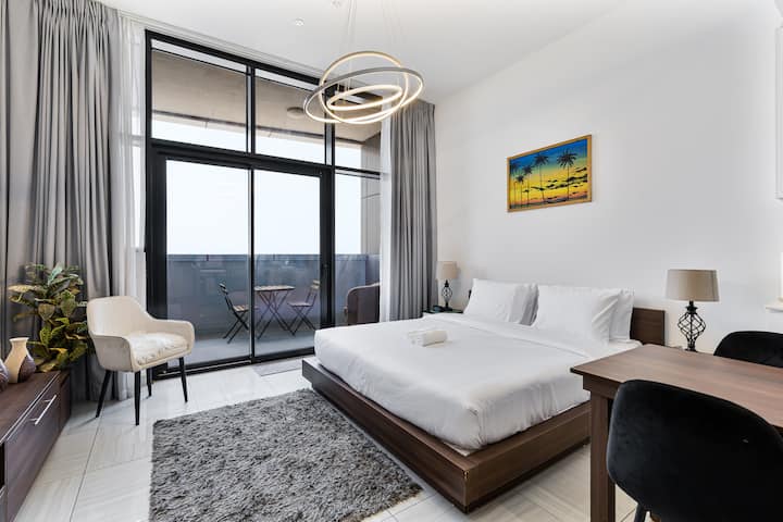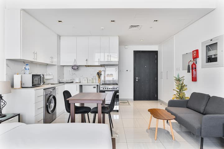 Kila maelezo katika studio hii iliyobuniwa kwa uangalifu katika Mnara wa O2, JVC imepangwa kwa uangalifu ili kukupa likizo maridadi na yenye starehe katika mojawapo ya vitongoji vyenye kuvutia zaidi vya Dubai. Iwe uko hapa ili kupumzika kwenye roshani ya kujitegemea, kuchunguza maeneo maarufu ya karibu au kufurahia ukaaji wa muda mrefu, mapumziko haya ya kisasa huchanganya kikamilifu maisha ya starehe na vitu vya kifahari. Tunatazamia kukukaribisha na kufanya ukaaji wako usisahau kabisa.