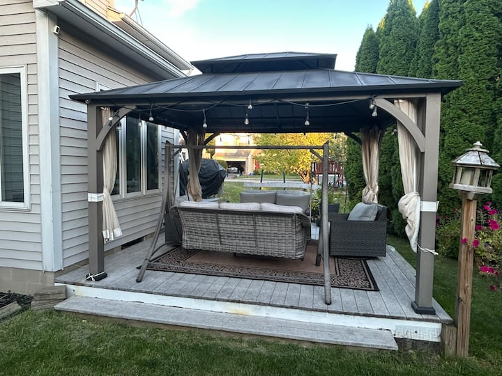 Sehemu ya kukaa ya nje/baraza iliyo na Gazibo, Sofa ya Swing, Samani za Baraza na Jiko la kuchomea nyama