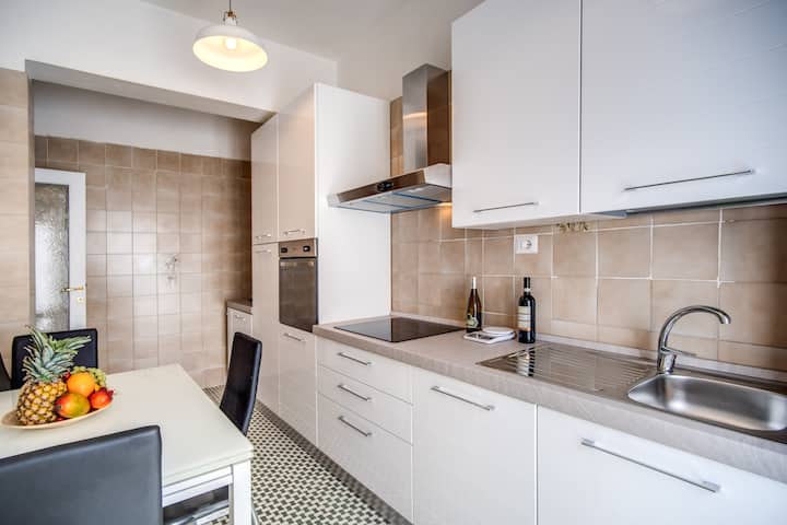 Jiko lililoteuliwa vizuri linajumuisha vitu vyote muhimu: vyombo, friji, jokofu, mashine ya kuosha vyombo, mashine ya kuosha, birika, oveni, meza yenye nafasi kubwa, mashine ya kahawa ya Kiitaliano na kiokaji. Jifurahishe na vistawishi vya bafu, ikiwemo kisanduku kikubwa cha kuogea, mashine ya kukausha nywele na taulo za kupangusia, kuhakikisha sehemu ya kukaa inayofaa na yenye starehe.