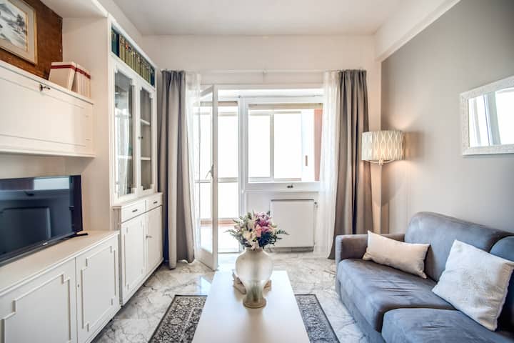Pata uzoefu wa mazingira makubwa na angavu ya fleti hii, ukijivunia vyumba viwili vya kulala vyenye ukubwa wa ukarimu vyenye vitanda viwili na AC, sebule yenye kitanda kizuri cha sofa mbili, jiko lenye vifaa kamili, bafu la kisasa na veranda yenye mwangaza wa jua kwa ajili ya nyakati za mapumziko.