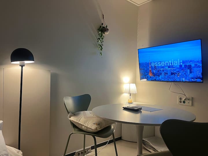 Chumba cha ✔ studio: kitanda 1 cha malkia, meza ya pembeni, televisheni mahiri ya inchi 43, meza, sofa, taa, mashine ya kufulia, pasi ya mvuke, rafu ya kukausha