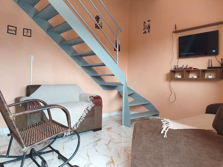 🛏️ Vyumba: 1 vyenye kiyoyozi, na kitanda cha watu wawili, kiyoyozi, runinga na roshani ya kujitegemea; na 1 na feni, pana na yenye hewa, na vitanda viwili vya mtu mmoja (kimoja ambacho ni kitanda cha kukunjika), kuhakikisha usiku wa kulala kwa familia nzima au kundi.