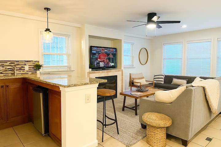 Mabafu mawili kamili — moja la chumba cha kulala na la ukumbi — yote yana mwanga, ni safi na yamejaa taulo, vifaa vya usafi wa mwili na kikausha nywele kwa ajili ya urahisi wako.