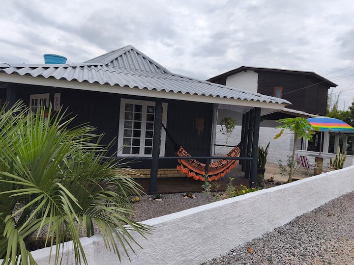 Sebule na jiko lililounganishwa, sehemu bora iliyo na vyombo vya jikoni, televisheni janja ya inchi 42 yenye ufikiaji wa Netflix na Globoplay, kitanda cha sofa cha kukaa watu wawili, mifuko miwili ya maharagwe.