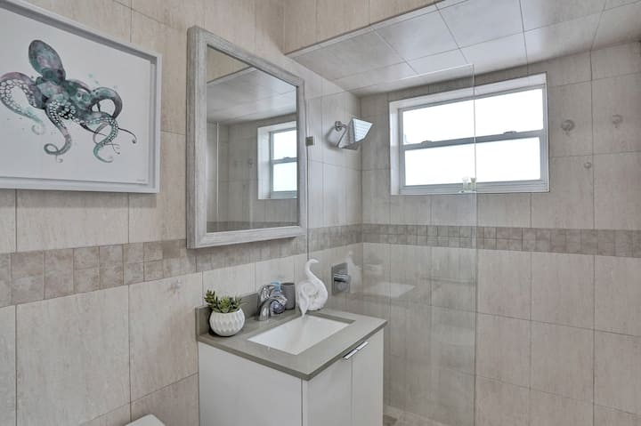 Chumba cha kupikia kinatoa kile unachohitaji kwa ajili ya kuandaa milo mepesi, ikiwemo nafasi ya kupika na kuhifadhi viungo. Mpangilio unajumuisha jiko, mikrowevu, friji na mashine ya kutengeneza kahawa, pamoja na vitu muhimu vinavyohitajika kwa ajili ya maandalizi rahisi ya chakula. Unaweza kufurahia kifungua kinywa rahisi kabla ya kuelekea ufukweni au kula chakula kidogo baada ya kuvinjari eneo hilo.