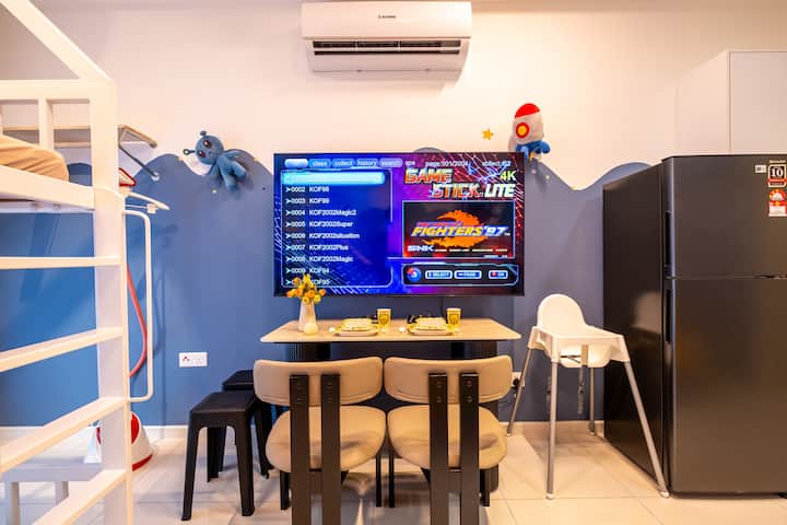 Sehemu yetu ya kukaa maridadi inachanganya starehe na burudani- ikiwa na kifaa cha michezo ya kompyuta cha zamani, midoli ya kupendeza, na vitanda laini vyenye starehe vinavyofaa kwa familia, marafiki, au wanandoa.