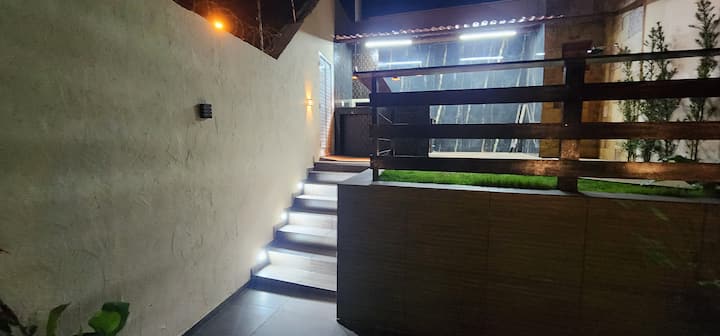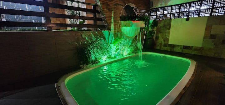 Roshani iliyo na bwawa la kuogelea lenye joto na jiko la kuchomea nyama