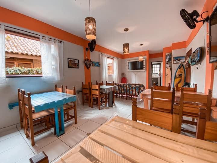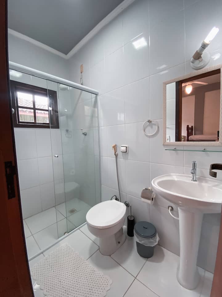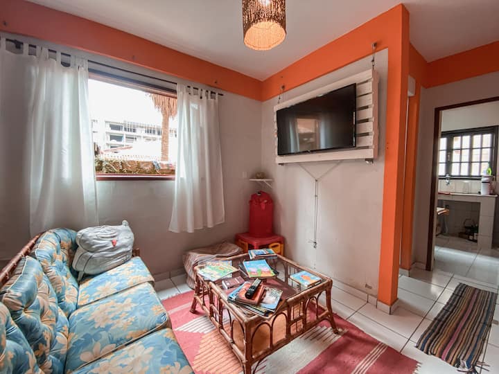 🍽️ Jiko la pamoja: Nyumba hii ina jiko la pamoja na wageni wengine, lililo na stoo ya chakula na eneo la kulia chakula, lililokusudiwa kwa matumizi ya msingi, kama vile kuandaa kahawa, vitafunio vya haraka au milo rahisi. Kupika milo kamili, kama vile mchele, maharagwe, vyakula vilivyokaangwa au vyakula vilivyopikwa kwa ustadi, hakuruhusiwi. Tuko umbali wa dakika 2 tu kutoka Praia Grande, pamoja na ufikiaji rahisi kwa miguu kwenye fukwe za Tenório na Vermelha do Centro. Eneo hili lina miundombinu kamili, ikiwemo mikahawa, mikahawa ya piza, mikahawa ya vitafunio, masoko na duka (maduka madogo), yote yanapatikana bila kuhitaji gari.