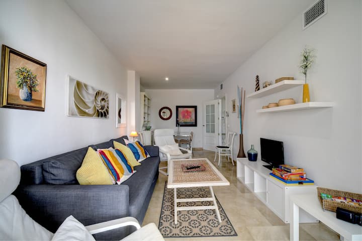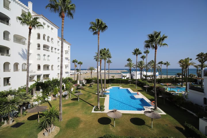 Fleti ya kifahari ya ghorofa ya chini yenye ufikiaji wa moja kwa moja kwa moja kwenye moja ya mabwawa mawili ya kuogelea huku nyumba ikiwa wazi mwaka mzima. Kutoka kwenye mtaro una mtazamo wa kupendeza wa Mediterania, Gibraltar, Afrika, promenade na Marina de la Duquesa.