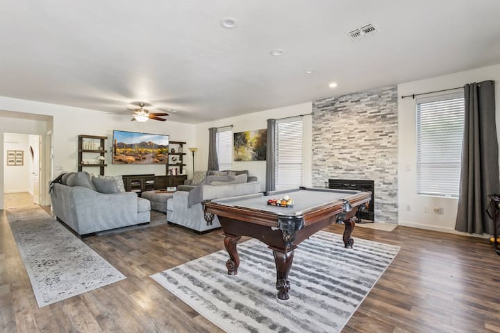Ingia ndani kwenye mpangilio angavu na wa kuvutia wa wazi ulio wazi unaojumuisha sebule yenye starehe, eneo la kulia chakula na jiko la kisasa. Jinyooshe kwenye viti vya kifahari huku ukitazama vipindi unavyovipenda kwenye runinga janja ya inchi 60 au ufurahie mchezo wa kucheza pool—mpotezaji anashughulikia usafi!