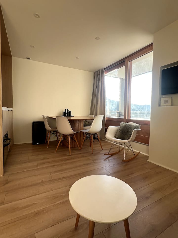 Fleti ya mita 30, mwelekeo wa kusini-magharibi katika makazi madogo ya ghorofa 3 yaliyo na mtaro unaoangalia skii na mbio za watoto. Iko katikati ya Mabonde 3, huko Val Thorens, katikati ya risoti, kwenye uwanda wa Place Caron katika cul-de-sac.