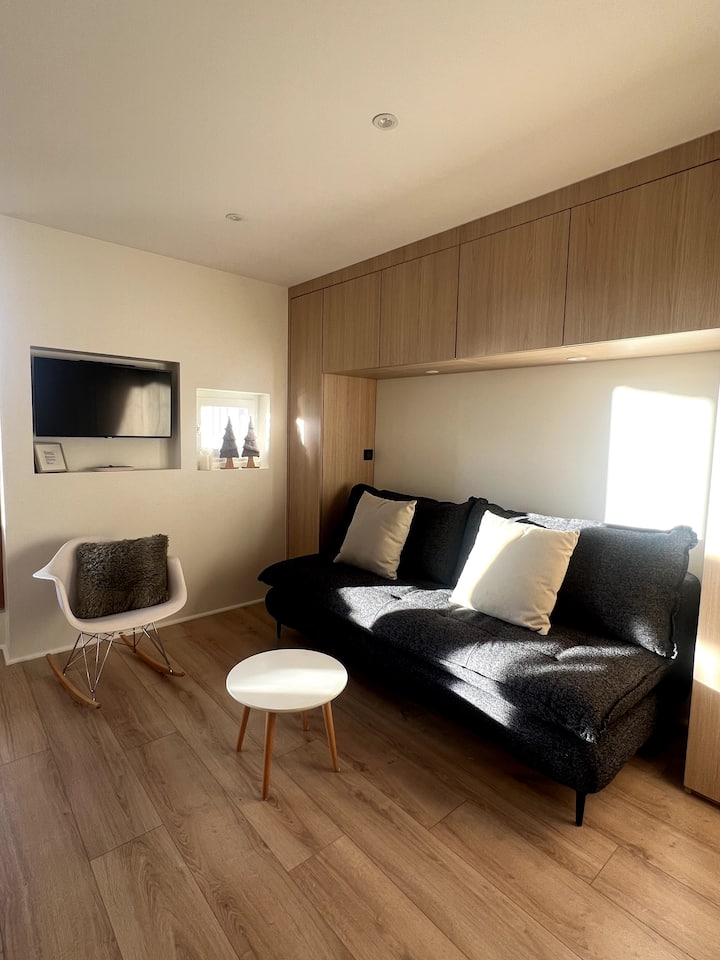 VIFAA: Kufurahia mazingira ya amani, katika eneo la mawe kutoka kanisani, fleti yetu ina roshani yenye mwonekano wa milima, kusini magharibi inayoangalia mteremko wa skii na mbio za toboggan. Linafikiwa kwa lifti. Fleti imerejeshwa kabisa na msanifu majengo kwa majira ya baridi ya 2024 -2025. Chumba cha kulala kina vitanda 2 vya ghorofa (hulala 3): kitanda 1 cha watu wawili chini na kitanda 1 cha mtu mmoja juu.