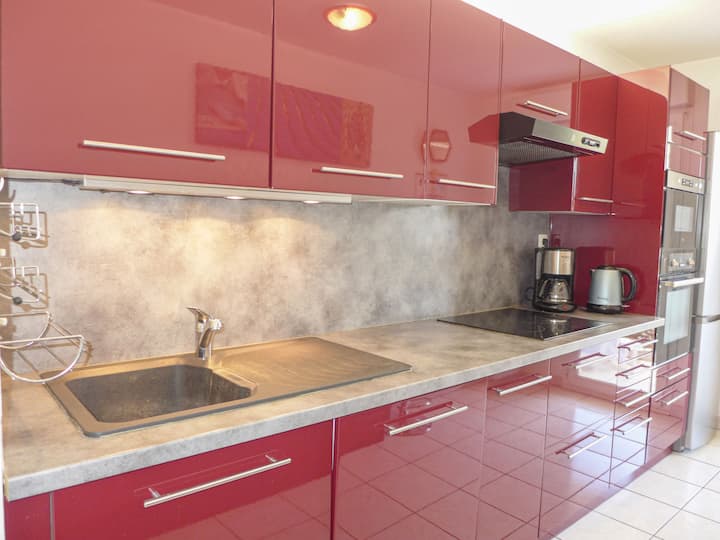 Jikoni (sahani 3 za moto, oveni, mashine ya kuosha vyombo, toaster, birika, mikrowevu, jokofu, mashine ya kahawa ya umeme). Bafu, sep. WC. Mfumo wa kupasha joto wa umeme. Terrace 20 m2. Samani za Terrace, viti vya sitaha (2). Vifaa: mashine ya kufulia, pasi. Intaneti (Wi-Fi, ya ziada). Nafasi ya gereji n 41, urefu wa sentimita 200. Tafadhali kumbuka: inafaa kwa familia fleti upande wa mtaa. Televisheni FR pekee. King 'ora cha moshi.