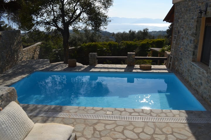 Nyumba ya familia ya Evia, mwonekano wa bahari wa bwawa la kujitegemea na bustani.