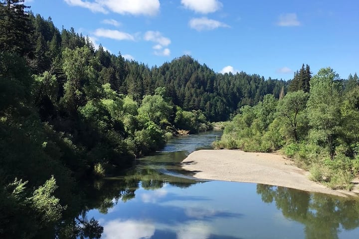 Happy Days, ambayo iko umbali mfupi tu kutoka katikati ya mji wa Guerneville, Mto Russian, maduka na nyumba za sanaa, ni eneo zuri la mapumziko lenye mwangaza na la kuchezea kwa ajili ya familia na marafiki.