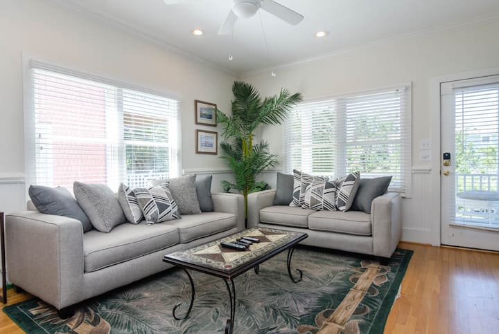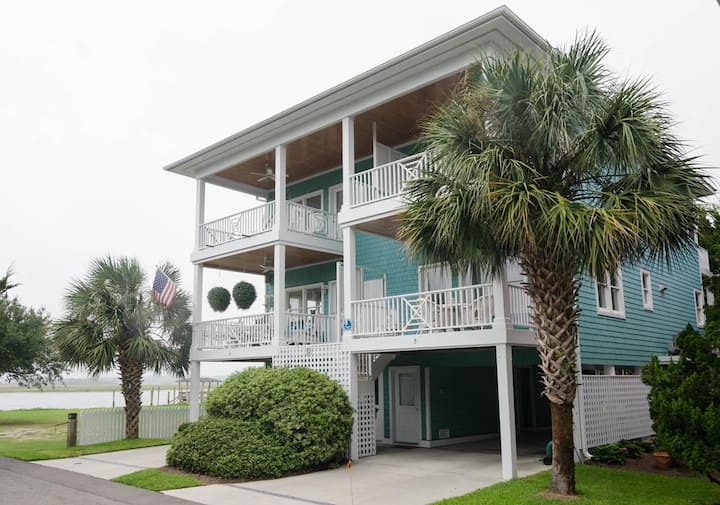Unapoingia kwenye "Sullivan" unasalimiwa na sakafu nzuri za mbao ngumu na mpangilio wa sakafu iliyo wazi. Chumba hiki kizuri kilicho wazi kinaruhusu familia kuendelea kuunganishwa iwe ni kula, kuketi kwenye sofa, au kuandaa vitafunio vya kuleta ufukweni. Ukumbi wa mbele uliofunikwa nje ya sebule una seti ya chakula cha nje. Furahia chakula cha jioni kwenye hewa ya chumvi jua linapozama juu ya njia ya maji. Kuna chumba cha kulala cha wageni kwenye ghorofa kuu ya maisha ambacho kimewekewa kitanda chenye starehe cha ukubwa wa malkia. Chumba hiki cha kulala cha wageni kinafunguliwa kwenye roshani iliyofunikwa – oasisi nzuri iliyofichika ya kwenda na kitabu unachokipenda. Bafu kamili kando ya chumba cha kulala cha wageni huongeza urahisi kwa wageni wanaokaa katika chumba hiki na pia wageni.